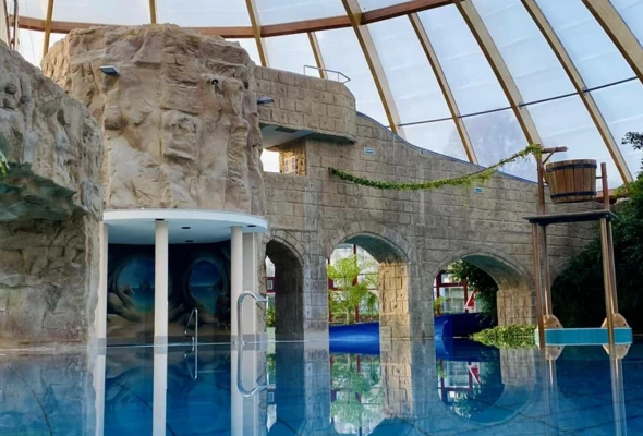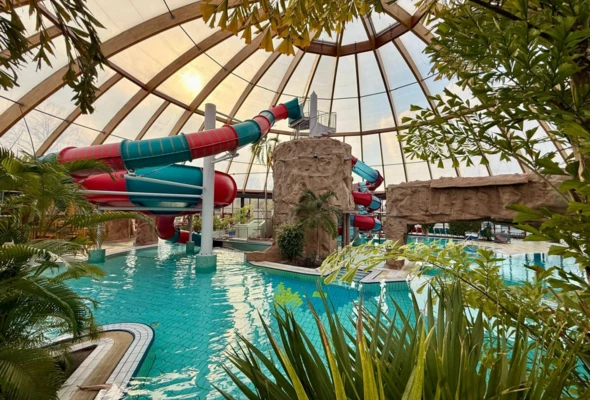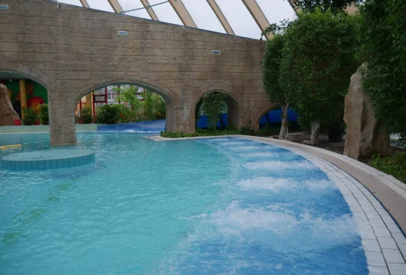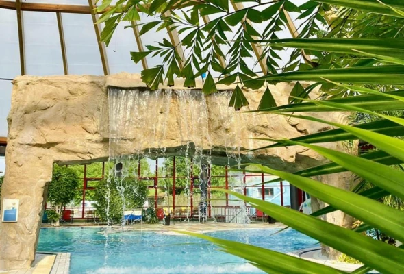 The facility includes a sports pool, indoor and outdoor leisure pools, a wave pool, a water slide complex, and relaxation areas enriched with greenery and design elements inspired by tropical landscapes. Additional features include food & beverage areas as well as dedicated family zones, such as children’s paddling pools and shallow water areas, ensuring a comfortable experience for a wide range of users.