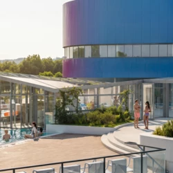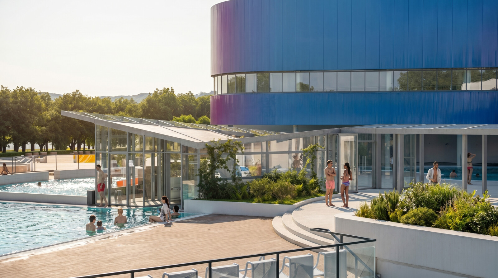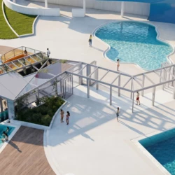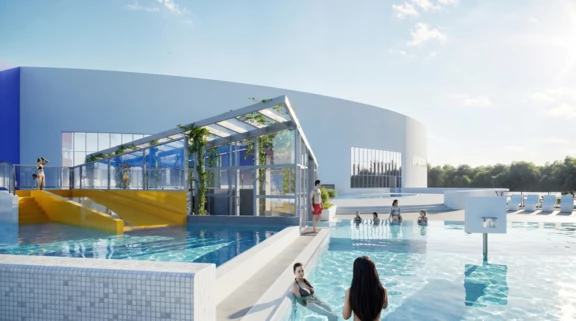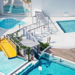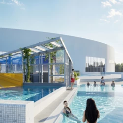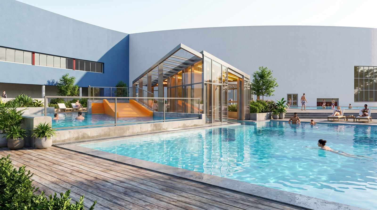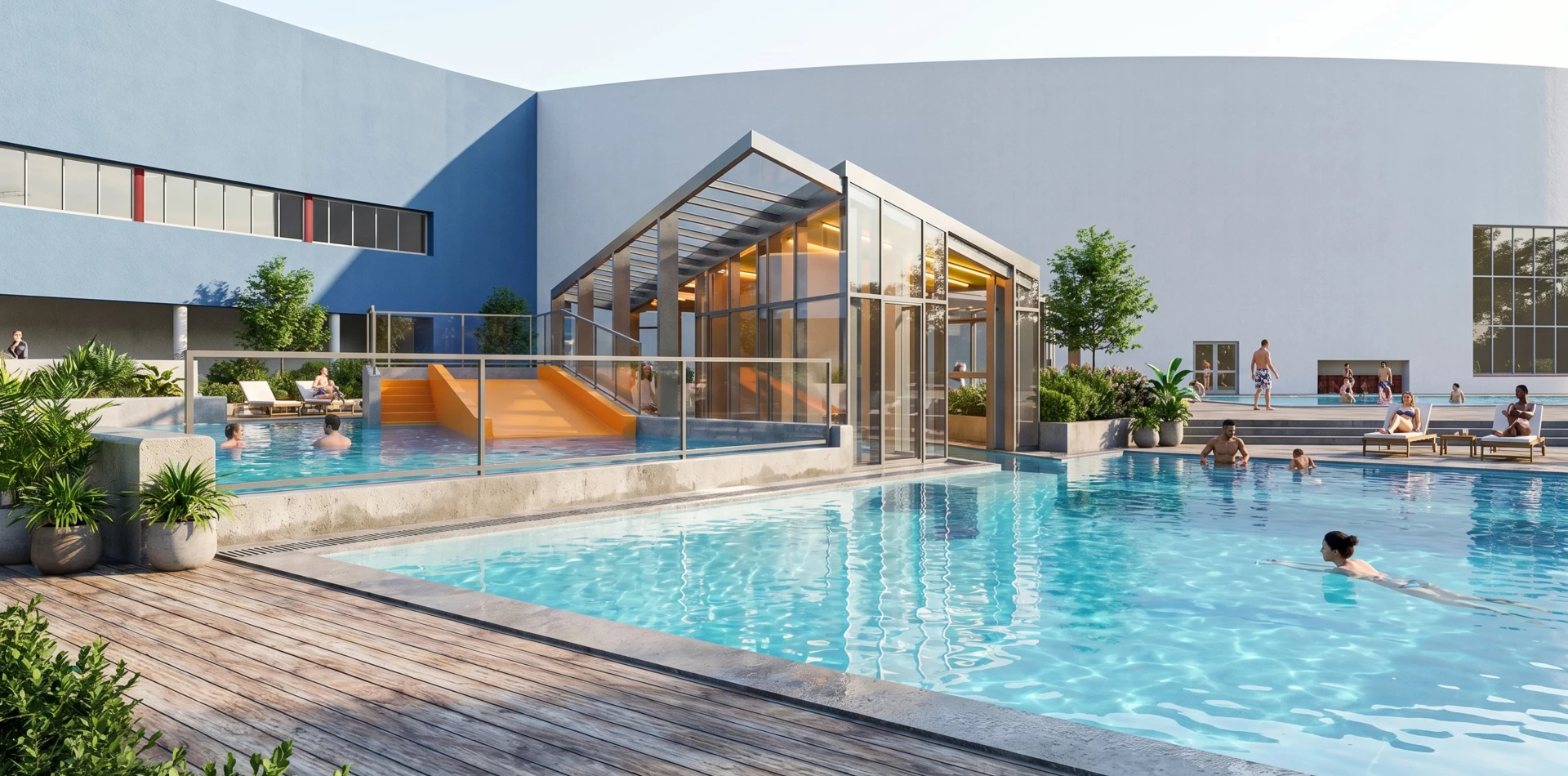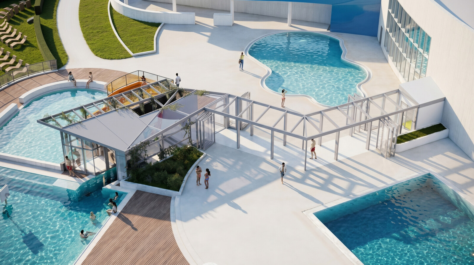 The design proposes the development of two complementary pool basins: a seasonal children’s paddling pool and a year-round recreational pool with water attractions. The terraced layout enables a clear functional distinction while creating an engaging and well-structured spatial composition. The children’s zone is linked to the existing area for the youngest users and the seasonal bar, while the year-round pool—located on an elevated terrace—provides direct access to the main hall via a glazed, covered connector.