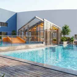 The extension of the outdoor pool area of Water Park Tychy to include a year-round outdoor pool and additional seasonal paddling pools for children represents a subtle continuation of the existing architecture, based on lightness of form and a harmonious integration with the surroundings. The transparent structures and the terraced arrangement of the new pools—a year-round recreational basin and a seasonal children’s pool—create a functional yet visually appealing leisure space. The design enhances the recreational potential of the facility while maintaining its overall coherence.