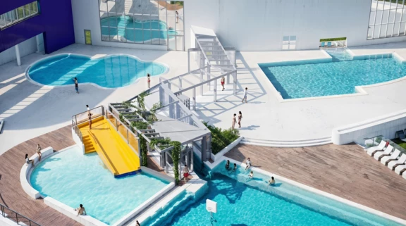 The design constitutes an extension of the existing outdoor pool zone of Water Park Tychy, located in its southern part. The new development has been deliberately integrated into the current layout as its natural continuation—without interfering with the main structure of the facility.