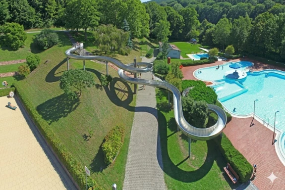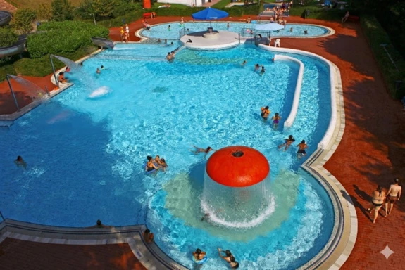 Sports pool, leisure pool with water attractions, diving pool, non-swimmer pool, children’s paddling pool, water slide complex, children’s zones, water features (geysers, showers, massage jets, lazy river), recreational and green areas, relaxation zones, changing facilities, technical infrastructure.
