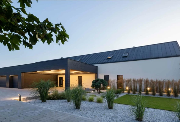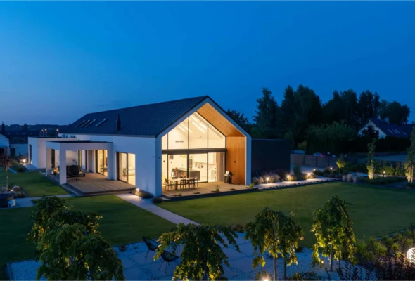The form of the house refers to the archetype of the traditional barn, understood as a symbol of simplicity, functionality and durability. The characteristic pitched roof and clean, symmetrical silhouette have been translated into a contemporary architectural language, allowing the building to retain a clear connection to tradition while gaining a refined and modern character. This interpretation brings together what is familiar and deeply rooted in collective memory with an aesthetic that responds to the contemporary way of living. The result is an architecture that is restrained yet distinctive, grounded in simplicity while carefully refined in both detail and proportion.