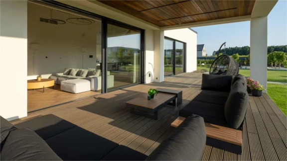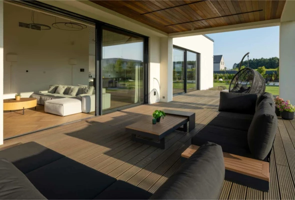 One of the key principles of the design is the strong opening of the interior toward its surroundings. Full height glazing fills the house with natural light and creates a fluid relationship between the living space and the garden. The open plan layout, high ceiling and terrace extending the day zone enhance the sense of spaciousness, freedom and everyday comfort. The house does not close itself within its own form, but extends into the landscape, allowing the boundary between inside and outside to become softer and more natural. It is precisely light, views and contact with greenery that shape the atmosphere of this place and define the quality of daily living.