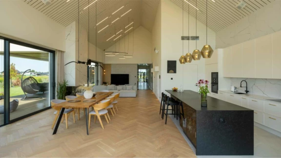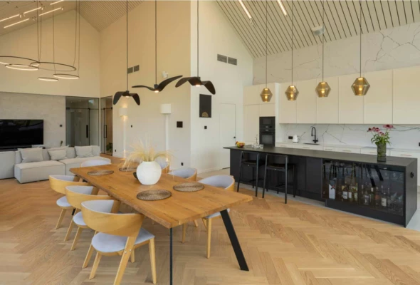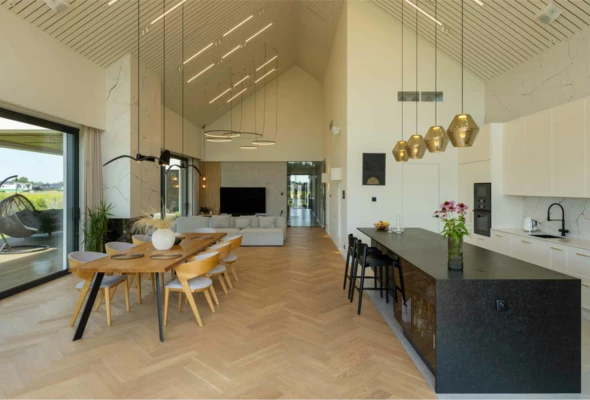 The architecture of the villa is based on restrained geometry and a subtle palette of materials that give it a calm and refined character. Natural wood, light surfaces and a delicate colour palette create an atmosphere of warmth, harmony and timeless elegance. Here, simplicity of form does not mean austerity, but rather a carefully balanced relationship between minimalism and the comfort of living. Material is not used merely as a finish, but as an element that co creates the identity of the house, influencing the perception of space, its scale and its everyday mood. As a result, the composition retains lightness and clarity without losing its domestic character.