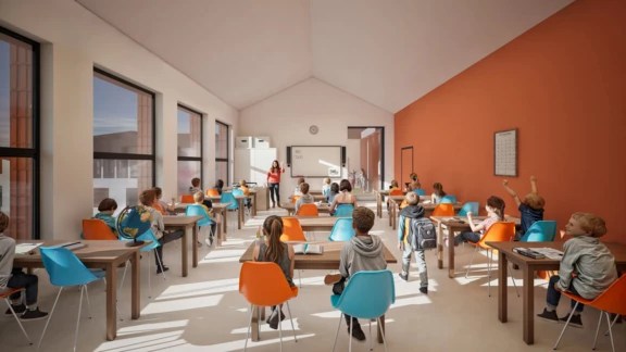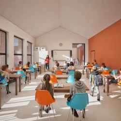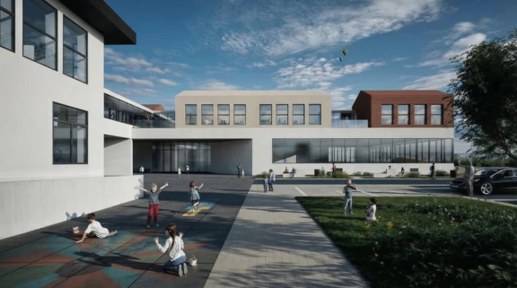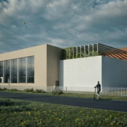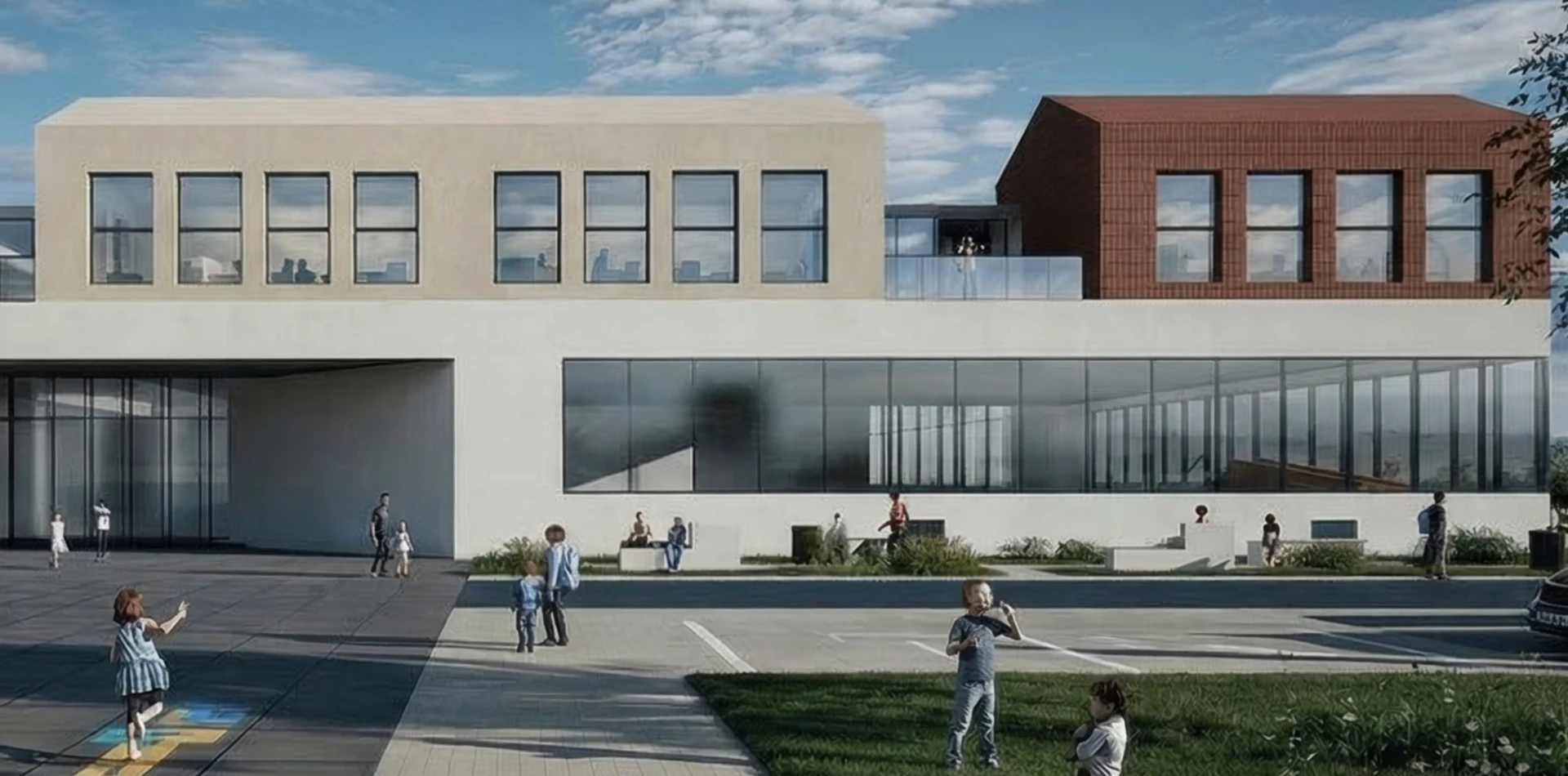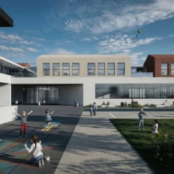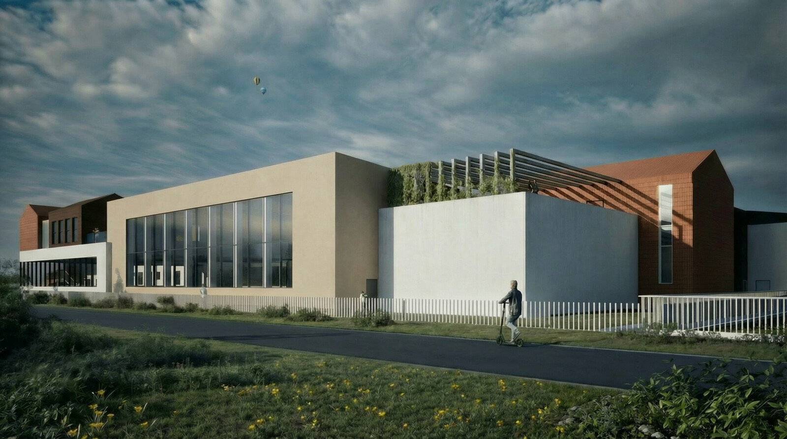 The building has been designed as an extension and complement to the existing school infrastructure. The new volume, connected to the school by a linking structure, forms a cohesive functional and spatial composition. The design opens toward its surroundings through a recessed entrance and a distinctive chamfered corner, strengthening its relationship with the central part of the site. The concept is complemented by an educational park, which extends the building’s functions into the outdoor space.