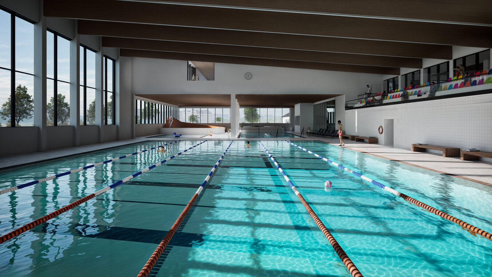 The complex is divided into three main functional zones: sports, pool, and educational, which interpenetrate and are connected by a representative main lobby—the central circulation hub.