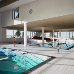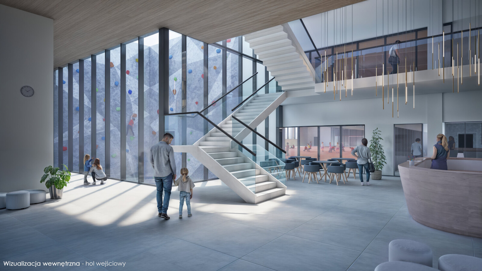 A modern complex in Radwanice combines sports, recreation, and education into one cohesive space. It includes a sports hall, a swimming and leisure pool, a sauna complex, and a squash zone, creating a place of activity for all user groups. A distinctive feature of the project is the “colorful village”—an intimate educational zone designed with the youngest users in mind.