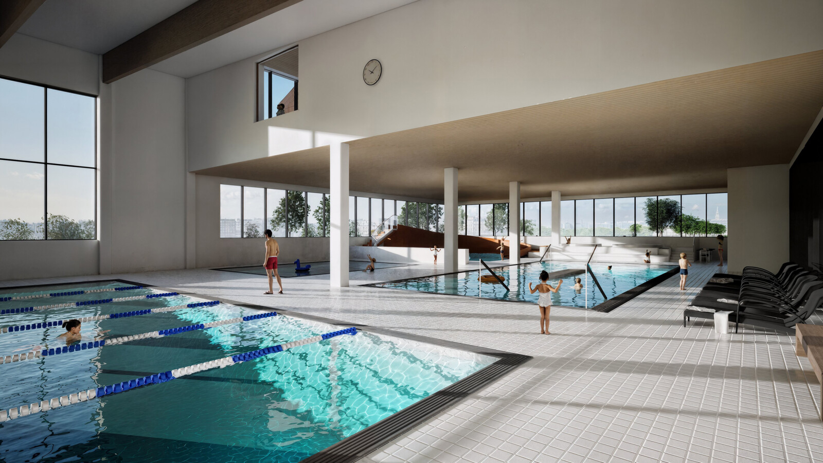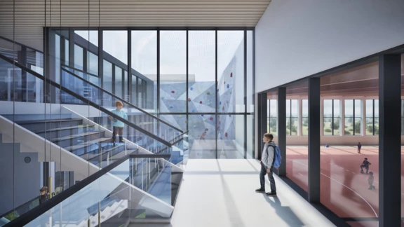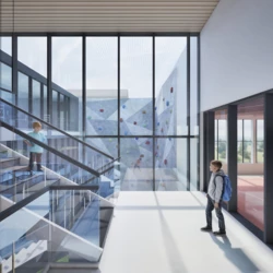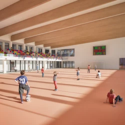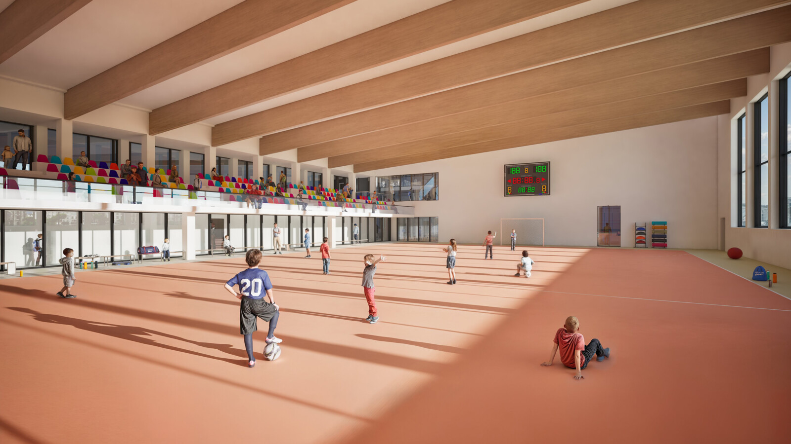 The sports zone includes a multifunctional sports hall with seating for 310 spectators, designed to accommodate events as well as everyday activities.