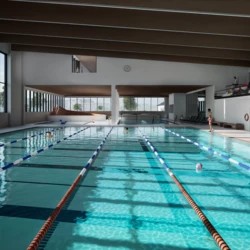 The pool area forms an extensive recreational and sports complex, comprising a six-lane swimming pool, a children’s pool, and a training and rehabilitation pool with a movable floor, as well as a leisure zone with water attractions and a jacuzzi.