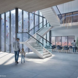 Additional facilities include two squash courts and a striking 13-meter-high climbing wall, visible from the lobby space through glazed walls.