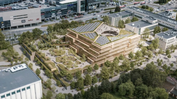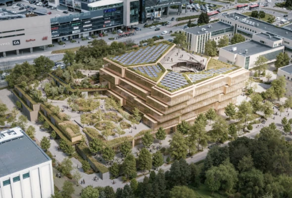 The architectural form is based on a spiral composition – a vortex – gently guiding visitors from the ground-floor lobby up to the rooftop terrace. Platforms rise gradually, creating a narrative journey through the world of knowledge and ideas, while an external green ring wrapping around the building introduces gardens on the upper levels, ensuring a connection with nature and offering views of the city.